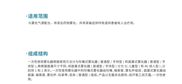 一次性使用霧化器根據(jù)使用方法分為咬嘴式霧化器:(普通型/手持型)和麵罩式霧化器(普(pǔ)通型/手持(chí) 型)。再根據麵罩尺寸不同(tóng),將麵罩式霧化器(普(pǔ)通型/手持型)分為S (兒童型)和M (成人型),分別用(yòng)1和(hé) 2表示。