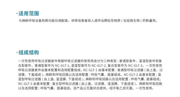 一次性使用呼吸過(guò)濾器套件根據呼吸過濾(lǜ)器的使用用(yòng)途分為(wéi)三種類型:普通型套件、溫濕型套件和複合型套件,普通型套件為NC-GLT-1,溫濕型(xíng)套件為NC-GLT-2,複合型套件為NC-GLT-3。