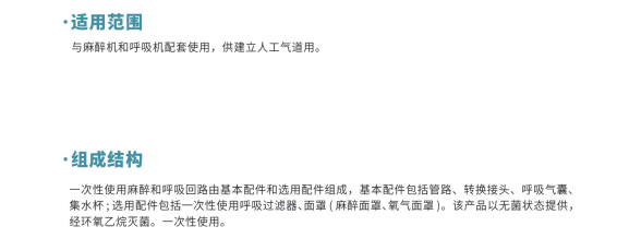 一次性使用(yòng)麻醉和呼吸回路由基本配件和選用配件(jiàn)組成(chéng),基本(běn)配件包括管路、轉換接頭、呼吸氣囊、集水杯;選用配件包括一次性使用(yòng)呼吸過濾(lǜ)器、麵罩(麻醉麵罩、氧氣麵罩)。該(gāi)產品以無菌狀態提供,經環氧乙環滅菌。一次(cì)性使用。